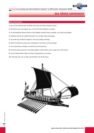 Um die Gesprächsrunde zu vertiefen, kann das Bild des römischen Fluss-Patrouillenschiffes (siehe Informationsblatt, unterer Teil) als Folie eingeblendet werden. Zunächst wird das Aussehen beschrieben, dann können Überlegungen zu Gebrauch und Nutzen bzw. zur Vorgehensweise bei, der Grenzverteidigung angestellt werden.