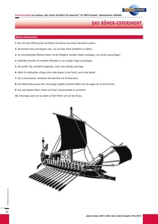 Diesbezüglich sind Methoden römischer Grenzsicherung von besonderer Bedeutung. Nur durch die ausgefeilte Organisation und die technisch nahezu perfekten Hilfsmittel konnte sie gelingen. Hier werden sowohl der hohe zivilisatorische, wirtschaftliche und kulturelle Grad des römischen Staatswesens als auch die Auswirkungen auf die Lebensweise der Germanen exemplarisch deutlich – dem Film „Wie sichern die Römer ihr Imperium?“ klar zu entnehmen. Gleichzeitig ermöglicht er den Blick auf die moderne Geschichtsforschung, indem das „Römer-Experiment“, der Nachbau eines Patrouillenbootes und seine Erprobung auf dem Rhein, dokumentiert wird.
