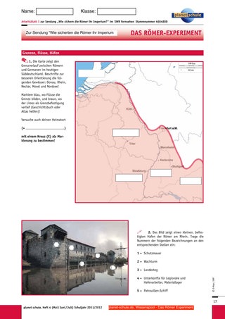 Die Lehrkraft leitet zum Film „Wie sichern die Römer ihr Imperium?“ über und verteilt an Partnerteams jeweils zwei Arbeitsblätter: Eines (Arbeitsblatt 1) befasst sich mit dem Grenzverlauf im damaligen Süddeutschland sowie mit der Beschriftung einer gesicherten römischen Anlegestelle – eher geeignet für Kinder, die über den visuellen Kanal besser lernen. Das andere (Arbeitsblatt 2) fasst die wichtigsten Inhalte des Films in Form verschiedener Aufgabentypen zusammen – für Kinder, die Informationen akustisch rasch verarbeiten können. Zu zweit besprechen sich die Schülerinnen und Schüler kurz, wer welches Blatt bearbeitet.