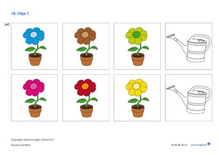 Die Klasse schaut sich zuerst den Clip an. Anschließend sprechen die Kinder über das Gesehene. Um die im Clip vorkommenden Satzstrukturen und die englischen Farbbezeichnungen zu verfestigen, gibt es ein Aktionsblatt pro Kinderpaar. Die Kinder schneiden die abgebildeten Gießkannen aus. Jedes Kind bekommt eine. Dann sagt das erste Kind: „Water for the green flower“. Das andere Kind gießt daraufhin die grüne Blume. Anschließend wird gewechselt.