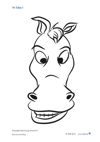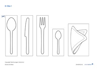 Vor dem Sehen: Die Kinder malen ihr Lieblingsgericht auf den Teller. Anschließend schneiden sie das benötigte Besteck aus, ordnen es um den Teller herum an und kleben es fest. In der Klasse stellen die Kinder dann ihre Arbeitsblätter vor (Beispiel: „For my meal I need a spoon and a knife“). Was essen David und Red wohl? Die Kinder stellen Vermutungen an und schauen gemeinsam den Clip.