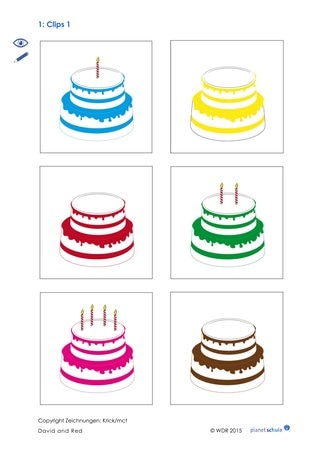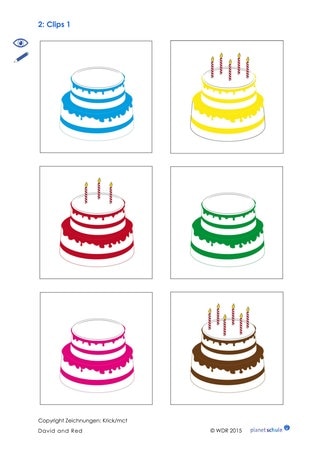 Im Anschluss an den Clip überlegt die Klasse: Wie alt ist Red? Wie alt ist wohl David? Um die vorkommende Frage-Antwort-Struktur zu verfestigen, arbeiten die Kinder zu zweit mit den Aktionsblättern 1 und 2. Auf den Blättern sind verschiedenfarbige Geburtstagskuchen der Sockenfreunde abgebildet.