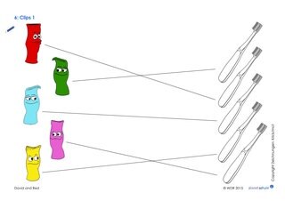 Direkt nach dem Clip spricht die Klasse über den Inhalt: Welche Farbe hat Reds Zahnbürste? Welche Farbe hat Davids Zahnbürste? Im Anschluss machen die Kinder mit Arbeitsblatt 6 ein Zuordnungsspiel: Welche Zahnbürste gehört welchem Sockenfreund? Die Kinder ordnen die Zahnbürsten den Socken zu, indem sie die Linien mit einem Stift verfolgen.