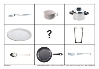 Angeregt vom Abwasch bei David und Red setzen sich die Kinder mit Geschirr auseinander. Sie lernen mit Hilfe von Bildkarten und gegebenenfalls realen Beispielen Geschirr-Begriffe kennen. Sind diese eingeführt, spielen die Kinder in Kleingruppen das Spiel "What's missing?": Die Bildkarten werden in beliebiger Anordnung offen auf dem Tisch ausgelegt. Ein Kind nimmt eine Karte weg, die anderen Gruppenmitglieder schließen dabei die Augen. Die fehlende Karte kann durch die Fragezeichen-Karte ersetzt werden. Nun fragt das erste Kind "What's missing?" Ein anderes antwortet "The plate/spoon... ist missing." Reihum ist nun das nächste Kind an der Reihe, eine Frage zu stellen.