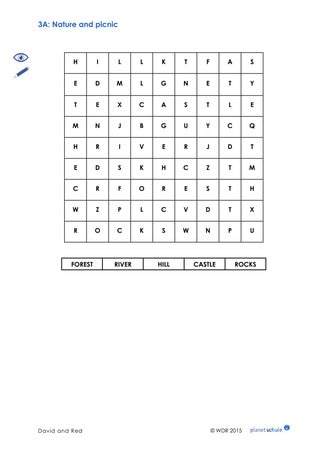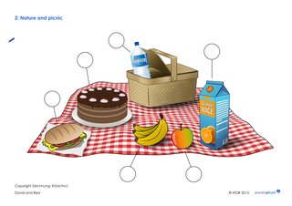 Was hat David für das Picknick eingepackt? Die Begriffe werden an der Tafel gesammelt. Danach beschäftigen sich die Kinder mit dieser Frage: Wer mag welche Lebensmittel / Getränke? Dazu gibt es ein Arbeitsblatt. Die Kinder malen Smiley-Gesichter in die Kreise: So kennzeichnen sie, was sie mögen bzw. was sie nicht mögen. Auf der Decke befinden sich auch Abbildungen von Dingen, die nicht im Film vorkommen.
