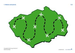 Abwechselnd nehmen die Kinder eine Karte, benennen sie und kleben sie an die mit den Kreuzen gekennzeichnete Stelle. Die Schülerinnen und Schüler vertiefen mithilfe des Spiels die im Film vorkommenden Vokabeln und Satzstrukturen. Jede Gruppe stellt ihre Wanderkarte schließlich im Plenum vor.