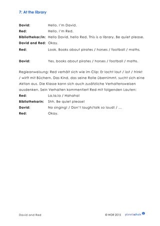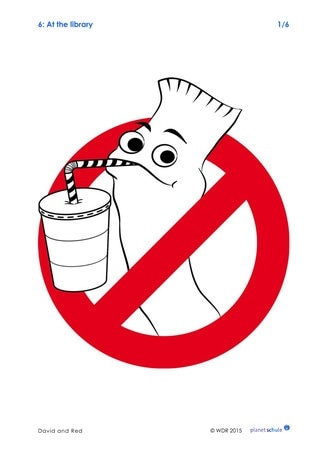 Was ist in einer Bücherei erlaubt, was ist verboten? Die Kinder spielen in Mini-Dialogen nach, wie man sich nicht in einer Bibliothek verhalten darf. Ausgangslage dafür ist Reds Verhalten aus dem Clip. Für die Lehrkraft gibt es einen Dialog als Vorlage (Materialblatt 7 „Dialog Bücherei“) und Bildkarten, mit deren Hilfe veranschaulicht werden kann, was in einer Bücherei nicht erlaubt ist. Wenn es in der Nähe der Schule eine Bücherei gibt, kann die Klasse im Anschluss einen Ausflug dorthin planen.