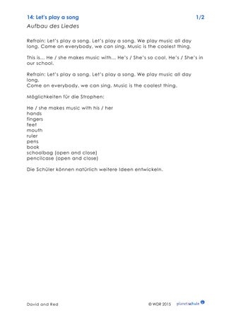 Die Klasse sieht den Clip noch einmal und dichtet dann ihr eigenes Lied zur Melodie von „Let’s play a song“. Dazu machen die Kinder Musik mit Händen und Füßen, sie singen, pfeifen oder benutzen Schulmaterial als Musikinstrumente. Die Strophen werden dann von allen Kindern gesungen, das besungene Kind führt sein Instrument vor. Beim Refrain machen alle Kinder Musik mit ihren „Instrumenten“. Auf Materialblatt 14 findet sich der Aufbau des Liedes sowie verschiedene Textideen für die Strophen. Die Kinder können natürlich eigene Ideen entwickeln. Den kompletten Liedtext gibt es auch auf diesem Materialblatt.
