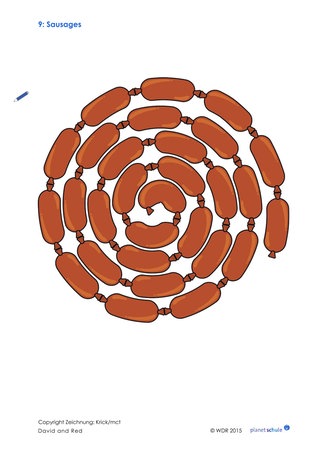 Die Klasse schaut den Clip. Dann überlegen sie: Wie viele Würstchen stiehlt Red vom Teller? Die Kinder schätzen oder raten. Danach schauen sich die Kinder den Clip noch einmal an: Wer hat richtig getippt (sechs Würstchen)? Anschließend wird gespielt: Mit ihrem Tischnachbarn würfeln die Kinder abwechselnd. Die gewürfelte Augenzahl streichen sie von der Würstchenkette auf dem Arbeitsblatt ab. Dazu sagt das Kind, das an der Reihe ist und beispielsweise eine Sechs gewürfelt hat: „Red eats six sausages“. Es wird so lange gewürfelt, bis alle Würstchen abgestrichen sind. Die Würfelzahl muss also genau der verbleibenden Anzahl an Würstchen entsprechen. In Anlehnung an den Clip vertiefen die Kinder so die englischen Begriffe für Zahlen.