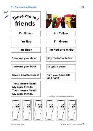 Die Klasse schaut sich den Musikclip an. Um den Liedtext besser zu verstehen, gestalten die Kinder ein Pocketbook (Basteltipp siehe Links und Literatur). Die erste Seite des Materialblattes enthält Textelemente und Zeichnungen: Auf die erste Seite kleben die Kinder den Schriftzug „These are my friends“ und das Bild von allen Sockenfreunden. Anschließend kleben sie auf die folgenden Seiten die Textkästen „I’m ...“, die Blanko-Socke und passende Anweisungen des Sockenfreundes.
