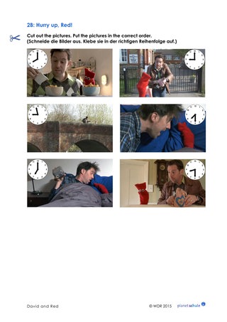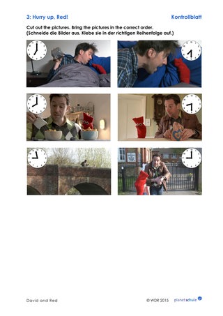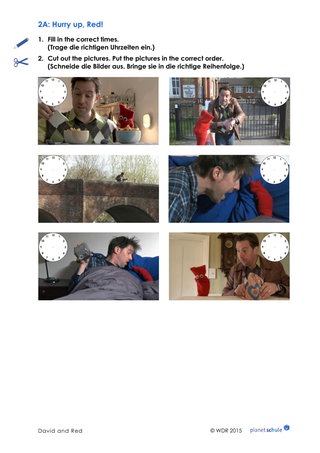 Die Schülerinnen und Schüler schneiden die Filmszenen auf dem Arbeitsblatt aus und bringen diese während des Sehens in die richtige zeitliche Reihenfolge. Das Arbeitsblatt liegt in zwei Varianten (2A und 2B) vor. Leistungsstarke Schüler zeichnen zusätzlich die richtige Uhrzeit ein. Je nach Leistungsstand kann der Film auch an den entsprechenden Stellen gestoppt werden, oder die Lehrkraft erzählt die Geschichte nach: