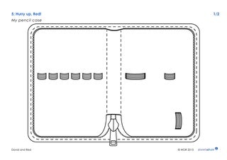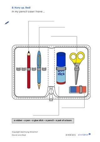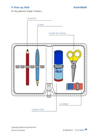 Die Schülerinnen und Schüler lernen die Wörter für Stifte, Schere, Lineal und Kleber und beschreiben ihr eigenes Schulmäppchen. Auf Arbeitsblatt 5 "Schulmäppchen" ist Reds Mappe eingezeichnet. Zunächst wird der Abschnitt des Films gezeigt, in dem Red seine Schultasche packt. Beim zweiten Ansehen legen die Schülerinnen und Schüler die Gegenstände, die im Film genannt werden, aus ihrem Mäppchen auf den Tisch.