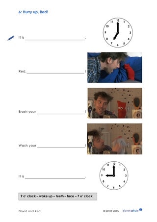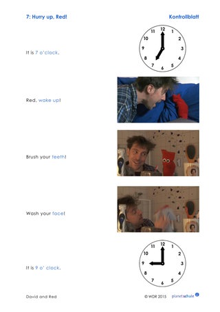 David and Red wachen auf und müssen sich für die Schule fertig machen. Die Kinder lernen den Tagesablauf am Morgen und die Uhrzeiten am Vormittag kennen. Red packt seine Tasche für die Schule.