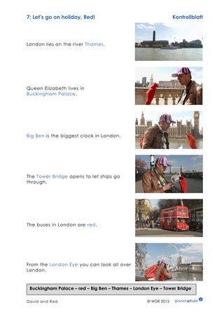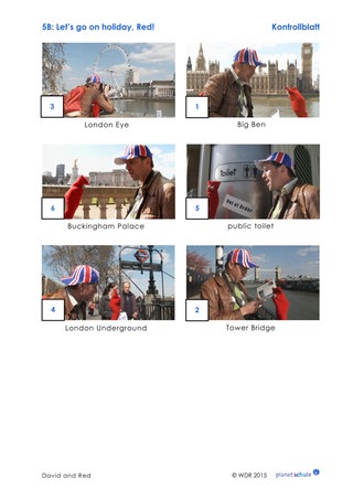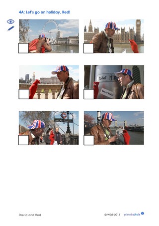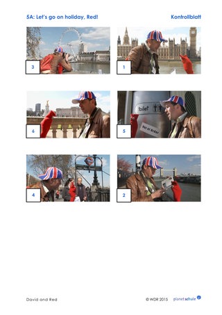 Mit einem Bilddiktat lässt sich das Hör-Sehverstehen üben. Die Schüler erhalten das Arbeitsblatt 4 "David and Red in London" mit Fotos von den Stationen, die David und Red besucht haben. Die Lehrerin/der Lehrer erzählt die Reisestationen nach, und die Schüler müssen die richtige Reihenfolge der Fotos festlegen, indem sie Nummern an die Bilder schreiben.