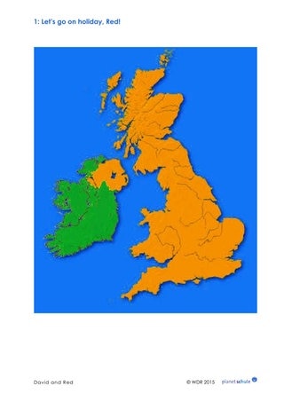 L: "David and Red are going to London. First they take the wrong train. The train goes to Scotland. Do you know where Scotland is? Scotland is in the north of the island. ... Here is London. London is a riverside city. The name of the river is Thames. Here you see the Thames."