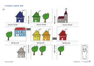 Dazu nutzen sie das Arbeitsblatt "Stadtplan", auf dem ein kleiner Stadtplan eingezeichnet ist. Sie schneiden die Figur von Red aus und bemalen ihn (zum Beispiel in der Farbe ihrer eigenen Socke). Die Figur bewegt sich auf dem Stadtplan nach den Anweisungen der Kinder. Ein Kind gibt die Anweisung, ohne auf den Stadtplan zu schauen, das andere Kind bewegt die Figur nach seinen Anweisungen. Nach der dritten Anweisung wird gefragt: "Where are you?" und das Kind erklärt, wo die Socke steht: "I am at the church", "I am in Spring Lane".