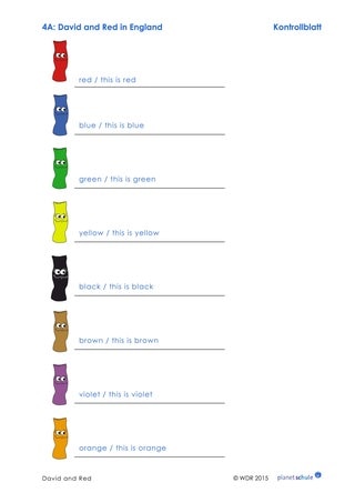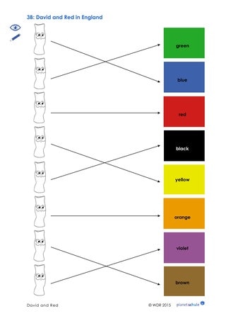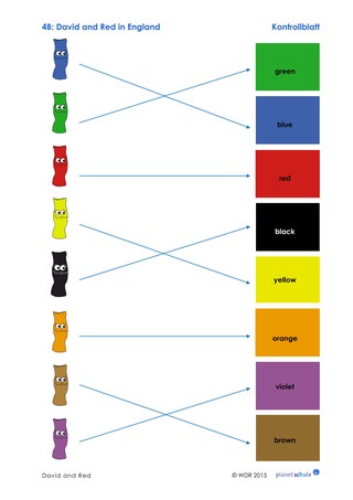Zur Verfestigung der Farbbezeichungen gibt es ein Arbeitsblatt. Es liegt in zwei Varianten vor. Je nach Leistungsstand beschriften die Schüler die verschiedenfarbigen Reds (Beispiel: "yellow / This is yellow"). Die Lehrkraft weist daraufhin, dass es sich bei "yellow" um die Farbbezeichnung handelt und nicht um einen Eigennamen, weshalb "yellow" kleingeschrieben wird. In einer zweiten Variante malen die Kinder die Socken der richtigen Farbe aus, auf die die Pfeile zeigen.