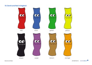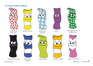 Die Socken können blau, grün, pink oder eine andere Farbe haben und auch ein Muster tragen. Die Namen wählen die Schüler frei, sie können damit aber auch Farben üben. Zum Einüben der Farben und Muster gibt es zwei beschriftete Materialblätter (Arbeitsblatt 1A und 1B) als Lernhilfe. Auf einem ist Red in verschiedenen Farben zu sehen, auf dem anderen Blatt hat er verschiedene Muster.