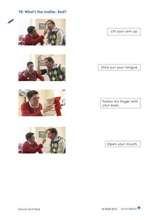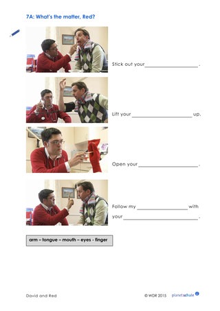 L.: "David is looking sick. He has a cold. Red asks him: Are you sick? David answers: No, I am fine. Now you ask your friends: Are you sick? Yes, I am. / No, I'm not. / No, I'm fine."
