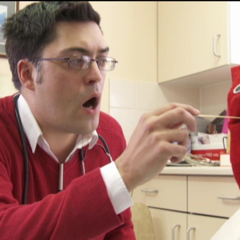 L: "Open your mouth, please. Stick out your tongue… . And say 'ahhhhh'. Follow my finger with your eyes. Lift up your arm, please."