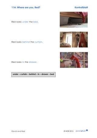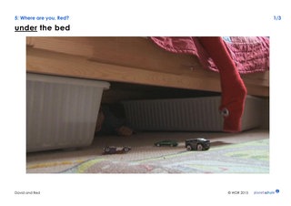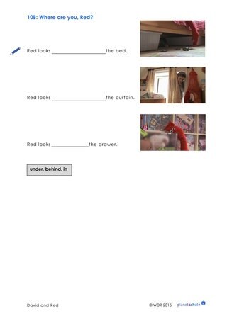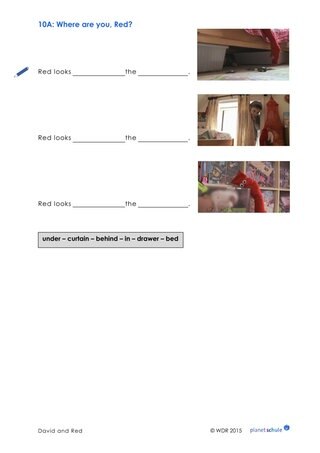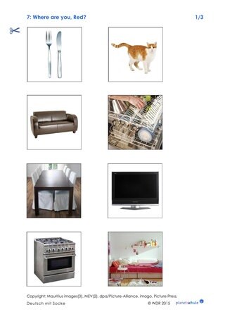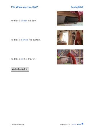 Nach einer Übungsphase gibt der Lehrer nur noch die Anweisungen ohne die entsprechende Handlung. Diese Übung kann auch in Kleingruppen gespielt werden, sodass alle Schülerinnen und Schüler die Gelegenheit bekommen, zu sprechen, zu hören und zu handeln. Die Bildkarte 5 "Präpositionen" kann zur Visualisierung der Vokabeln an der Tafel angebracht werden.