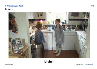 Um die Begriffe für die Zimmer einzuführen, können Sie zunächst an das Versteckspiel anknüpfen. Fragen Sie die Schüler, wo die Kinder nach Red gesucht haben und ergänzen Sie die richtigen Sätze. Dabei helfen die Bildkarten von den Suchsituationen.