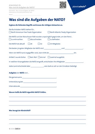 Die Schülerinnen und Schüler erhalten Arbeitsblatt 2a oder 2b (differenziert) und schauen den Film über die NATO an. Arbeitsblatt 2b sollte in höheren oder leistungsstärkeren Klassen verwendet werden.