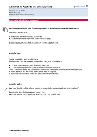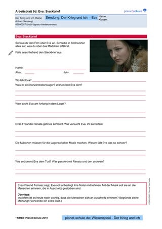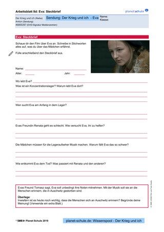 Am Ende des Films fordert Evas Freund Tomasz die Protagonistin auf, mit ihrer Musik dafür zu sorgen, dass die Toten von Auschwitz nicht vergessen werden. Als letzte Frage auf dem Steckbrief werden die Schülerinnen und Schüler aufgefordert, darüber nachzudenken, warum es auch heute noch wichtig ist, über den Holocaust zu sprechen und die Erinnerung daran weiterzutragen. Darüber können sie sich im Klassengespräch austauschen.