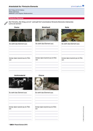 Mithilfe von fünf Karten (Arbeitsblatt 9a: Filmische Elemente) befassen sich die Schülerinnen und Schüler mit den fünf filmischen Elementen der Reihe. Die Aufgabe kann sowohl als Einzel- als auch als Partnerarbeit angeboten werden.