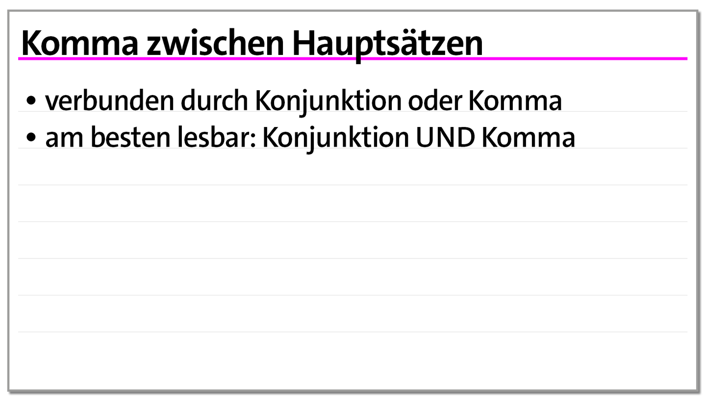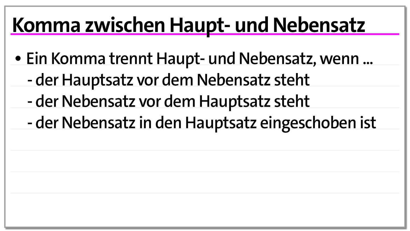 Ein Hauptsatz kann alleinstehen, während ein Nebensatz von einem Hauptsatz abhängig und durch eine Konjunktion (z.B. weil, da, als) mit diesem verbunden ist. Um den Unterschied zwischen Haupt- und Nebensatz zu erkennen, achte auf die Position des konjungierten Verbs: Im Hauptsatz steht es an zweiter Stelle, im Nebensatz am Ende. Ein Komma trennt diese beiden Satzarten und sorgt für Klarheit.