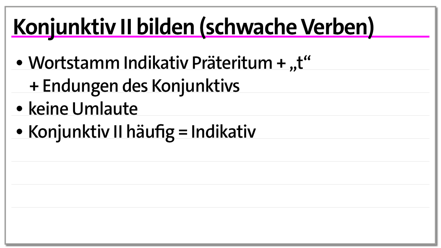 Bei einer Vielzahl von Verben - insbesondere bei schwachen oder seltenen Verben - wird der Konjunktiv mit dem Wort “würde” verwendet, um die Konstruktion zu vereinfachen. Außerdem ist manchmal der Konjunktiv II identisch mit der Form im Indikativ Präteritum.