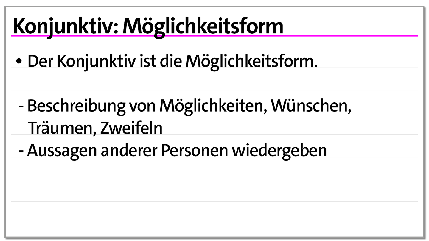Es gibt zwei Formen: den Konjunktiv I und den Konjunktiv II. Der Konjunktiv I wird hauptsächlich zur Wiedergabe von Redebeiträgen genutzt, während der Konjunktiv II oft als Ersatzform dient, wenn der Konjunktiv I nicht vom Indikativ Präsens zu unterscheiden ist.