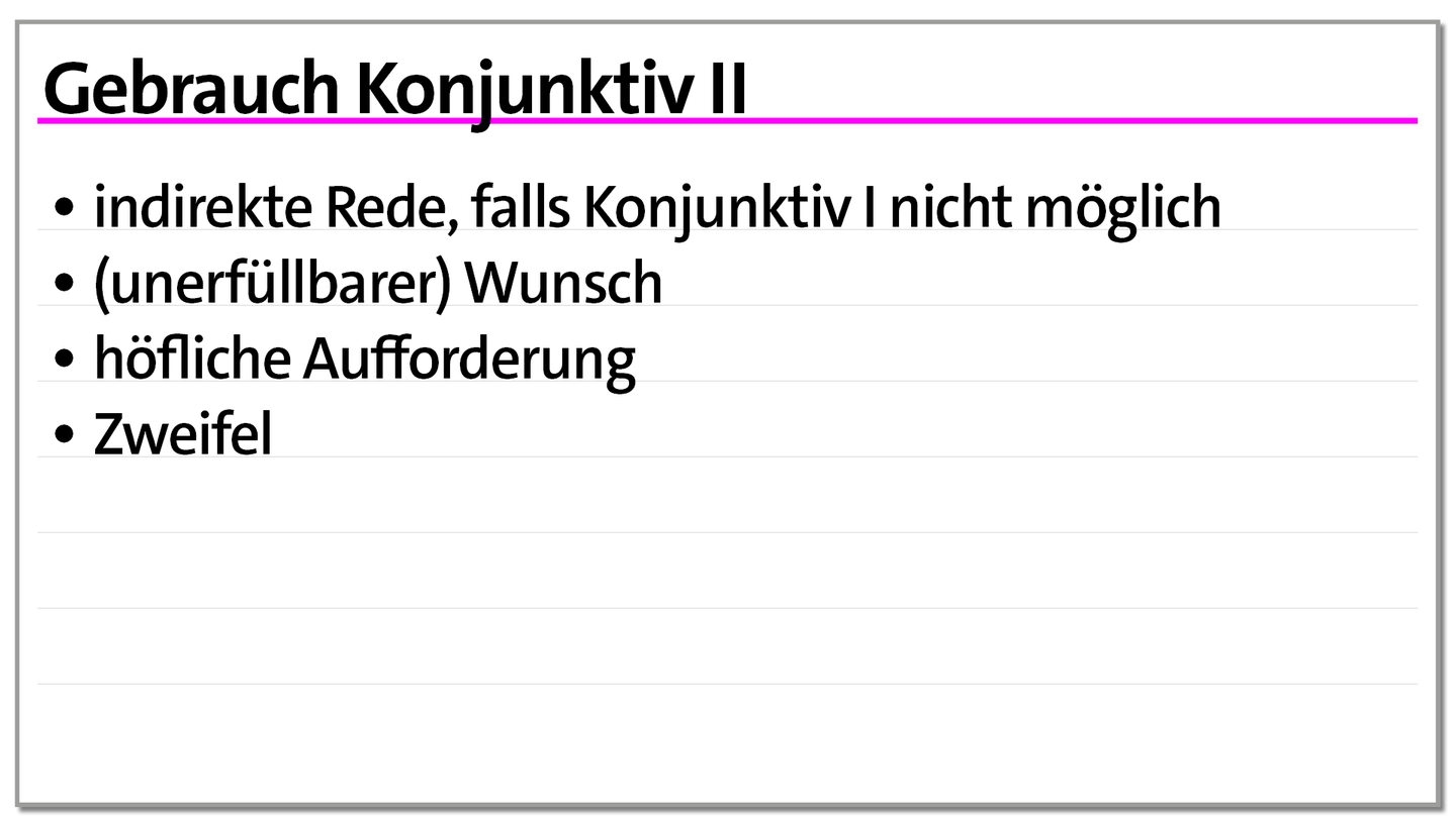 - Irreale Bedingungssätze (um etwas nicht Wirkliches aufzuzeigen). Beispiel: Wenn ich Lust hätte, käme ich mit.