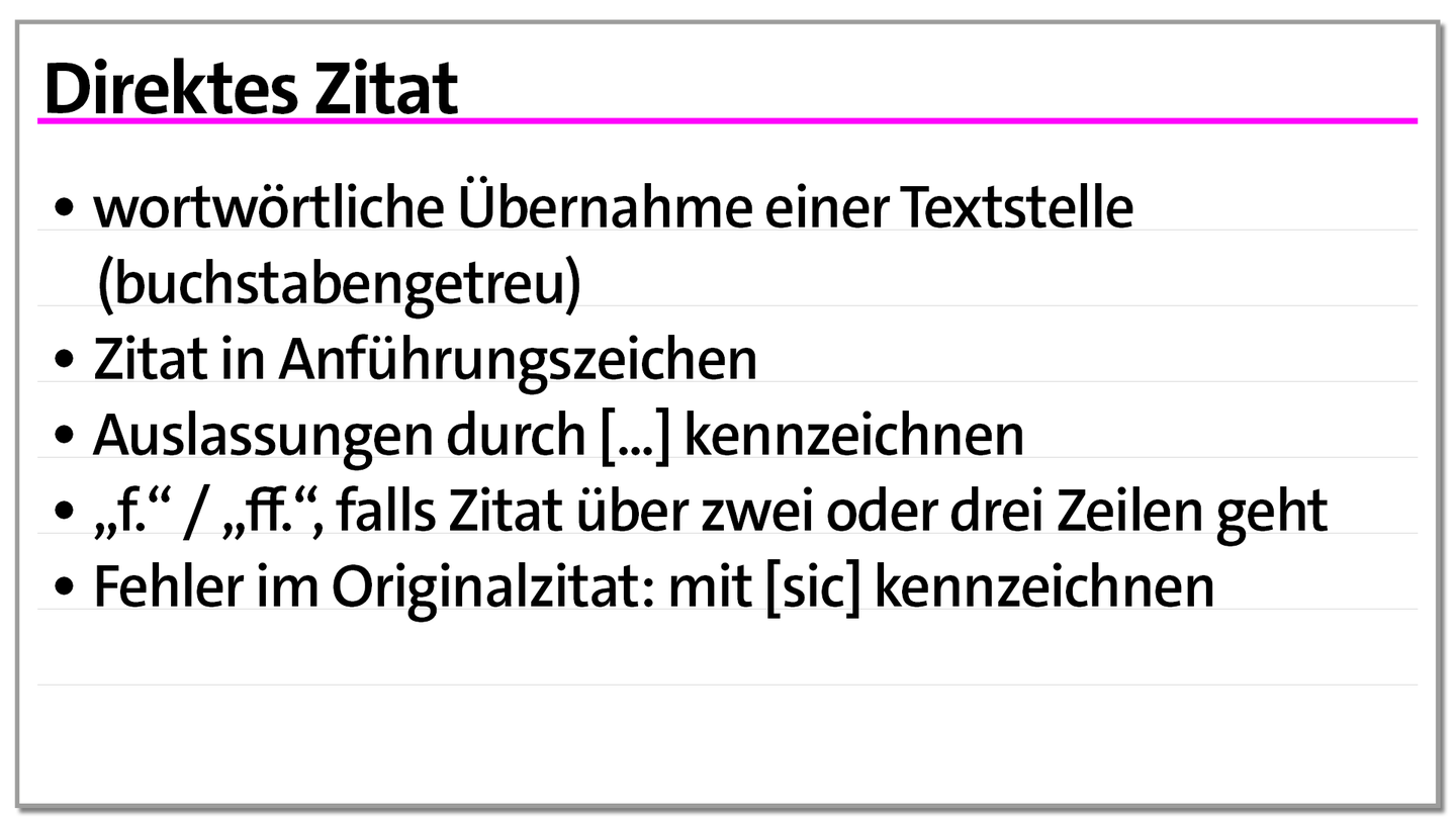 - Kurze Zitate (bis zu 3 Zeilen) werden in den Fließtext eingearbeitet und mithilfe von Anführungszeichen gekennzeichnet.