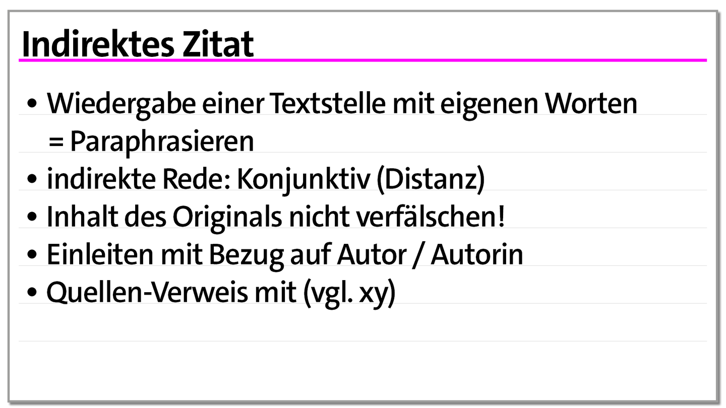 Indirekte Zitate geben den Inhalt eines Textes in eigenen Worten wieder. Diese Technik wird häufig genutzt, um die Kernaussagen eines Textes zu paraphrasieren (Wiedergabe in eigenen Worten) und in den eigenen Argumentationsfluss einzubinden. Indirekte Zitate erfordern den Einsatz des Konjunktivs, um die Distanz zum Originaltext zu wahren. Sonst würdest du dir jede Aussage des Autors selbst zu eigen machen. Beim Paraphrasieren ist es wichtig, die ursprüngliche Aussage nicht zu verfälschen und die Quelle korrekt anzugeben. Somit erfolgt zwar keine wörtliche Wiedergabe, aber eine Umschreibung des Gedankens.