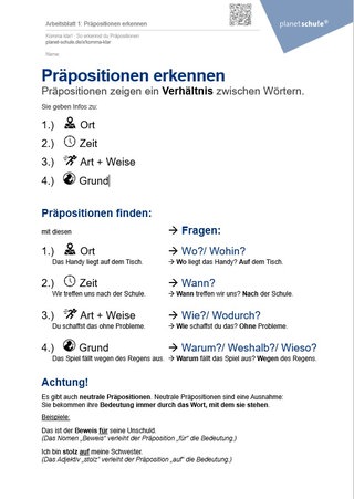 Am Ende erwarten Johanna mehrere Challenges zum Thema Präpositionen. Die Schüler:innen können bei diesen Übungen entweder einfach mitraten, während sie das Video schauen, oder sie können die Aufgaben parallel auf dem Arbeitsblatt lösen, das optional eingesetzt werden kann. Als Gedankenstütze liefert das Arbeitsblatt auch noch mal einen kurzen Überblick über die Definition und die Check-Fragen für Präpositionen.