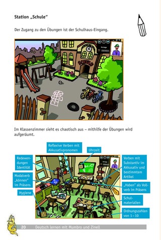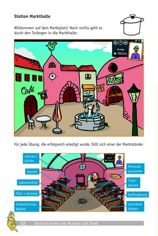 Von der Höhle aus gelangt man über die Symbole aus der Menschenwelt zu mehreren Stationen. Zur Auswahl stehen die Markthalle (Kochtopf), der Bauernhof (Mistgabel), die Schule (Bleistift) und der Zirkus (Trommmel). Jede Station enthält neun Übungen, die wiederum in vier Kompetenzebenen aufgeteilt sind: Kennenlernen / Hören / Lesen / Schreiben.