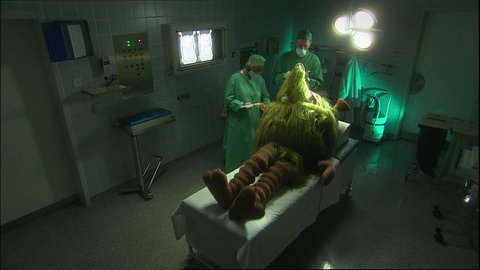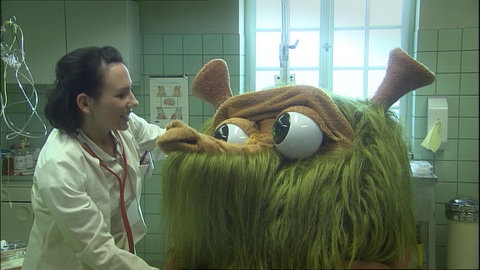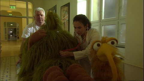 The King wishes to receive „sounds“. In the World of the Humans, Mumbro and Zinell get into an ambulance and end up at the emergency room of a hospital. Mumbro is being examined and a doctor wants to operate on him. In order to save Mumbro, Zinell and a helpful young woman doctor “kidnap” Mumbro and escape. Back in their underground world, the two friends offer their King a stethoscope. At first the King is not amused.