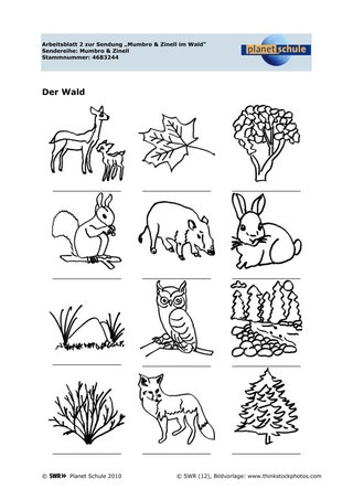 Einstieg in die Binnenhandlung: Für die meisten Schüler dürfte das Thema „Wald“ Anknüpfungspunkte bieten, wenn es auch Schüler in der Gruppe geben kann, die noch nicht lange in Deutschland leben und aus Gegenden kommen, in denen es kaum Wälder gibt. Arbeitsblatt 2 : Der Wald bietet einen Einstieg in die Thematik, da die Schüler sich zu den abgebildeten Gegenständen äußern können und sie beschriften können. Stärkere Schüler können ermutigt werden, von eigenen Erfahrungen und Erlebnissen im Wald zu berichten oder auch das Arbeitsblatt um Gegenstände zu ergänzen, die ihrer Meinung nach dazugehören. In diesem Zusammenhang kann es sich für die Lehrkraft auch anbieten, das Arbeitsblatt auf Folie zu ziehen und auf dem Projektor zu zeigen.