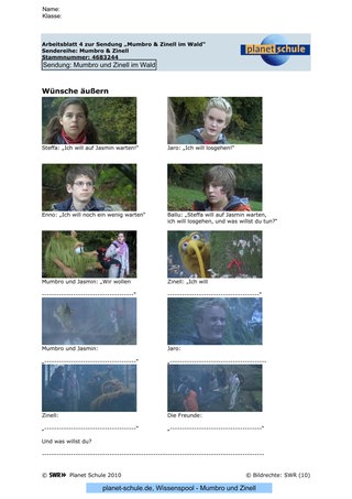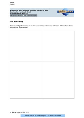 Nach dem Betrachten des Films werden sie aufgefordert, wichtige Szenen als Zeichnung in Arbeitsblatt 3: Die Handlung einzutragen. Sprachstarke Schüler können auch die Rückseite des Arbeitsbogens dazu nutzen, ihre Bilder zu beschreiben oder zu erklären. Die Besprechung des Arbeitsbogens wird einen starken Sprachumsatz provozieren, da die Schüler ihre Bilder erläutern wollen und in den Zusammenhang der Handlung einordnen wollen.