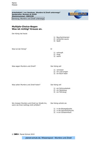Da die Einstiegsphase der Folge zunächst nichts mit dem Thema Verkehr zu tun hat, bietet es sich an, diesen Teil zunächst gesondert zu bearbeiten, das Arbeitsblatt dazu auszufüllen und erst später auf das Thema Verkehr zu sprechen zu kommen. Die Lehrperson zeigt zunächst die Passage in der Höhle. Im Anschluss daran (gegebenenfalls auch parallel zum Anschauen oder bei einem zweiten Durchgang) füllen die Schülerinnen und Schüler den Multiple-Choice-Bogen aus (Arbeitsblatt 1). Am Ende der Einstiegsphase können sie Vermutungen anstellen, was die beiden Agenten dem König mitbringen werden. Dabei geht es darum, eine Hypothese zu bilden und damit Neugier auf das Kommende zu wecken.