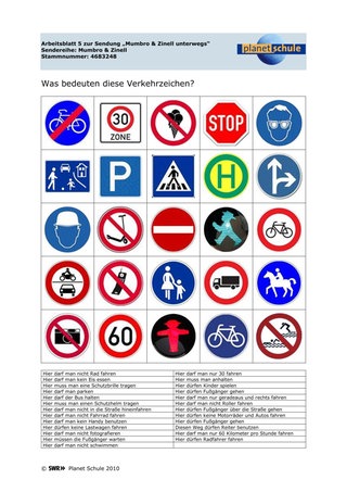 Die Folge ´Unterwegs´ bietet zahlreiche Anknüpfungspunkte für die Fortführung des Themas außerhalb des Unterrichts. So kann man mit den Kindern z. B. einen Ausflug in das Stadtviertel unternehmen, mit ihnen die Bedienung eines Fahrkartenautomaten erkunden, eine Fahrt in einem öffentlichen Verkehrsmittel unternehmen oder Verkehrszeichen erklären, siehe Arbeitsblatt 5. Oder man lässt die leere Skizze eines Stadtplans von den Lernenden ausfüllen, und die Kinder beschreiben dem Rest der Lerngruppe, wo sich was befindet (z. B. das Hotel ist in der Poststraße, neben dem Hotel ist die Post …). Die übrigen Schüler zeichnen dann die entsprechenden Gebäude ein. Außerdem kann man mit Straßenkreide einen Stadtplan auf den Schulhof malen und jeweils einen Schüler / eine Schülerin einen Weg beschreiben und ein anderes Kind den beschriebenen Weg nachgehen lassen. Ausgehend von den Szenen zwischen Timo und den anderen Skatern lassen sich kleine Szenen erfinden, in denen die Schülerinnen und Schüler z.B. Konfliktsituationen in der Pause nachspielen.