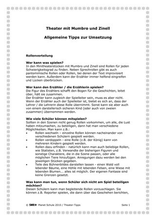 - 10 Ministücke auf der Basis der Fernsehfolgen: Hier gibt es jeweils eine Kerngeschichte (Kernszenen) mit einem Minirahmen als Einstieg und Ausstieg. Jedes Ministück kann entweder für sich gespielt werden, dann beginnt es mit einer kurzen Einführung vom Erzähler. Oder es wird als Folgestück an ein anderes Stück angesetzt. Dann schafft der Erzähler den Übergang mit einem verbindenden Erzählstück. So kann man beliebig viele Stücke in beliebiger Reihenfolge zusammenfügen. Dabei können die durchgängigen Rollen der Stücke – also der Erzähler, Mumbro, Zinell und der König - variieren. Sie müssen nicht immer von denselben Schülerinnen und Schülern gespielt werden. Auf diese Weise können auch unterschiedliche Klassen oder Gruppen ihren Teil zu einem gemeinsamen Ganzen beisteuern. Und nach jedem Ministück findet man außerdem Tipps zur Umsetzung, die sich an die Schüler richten.