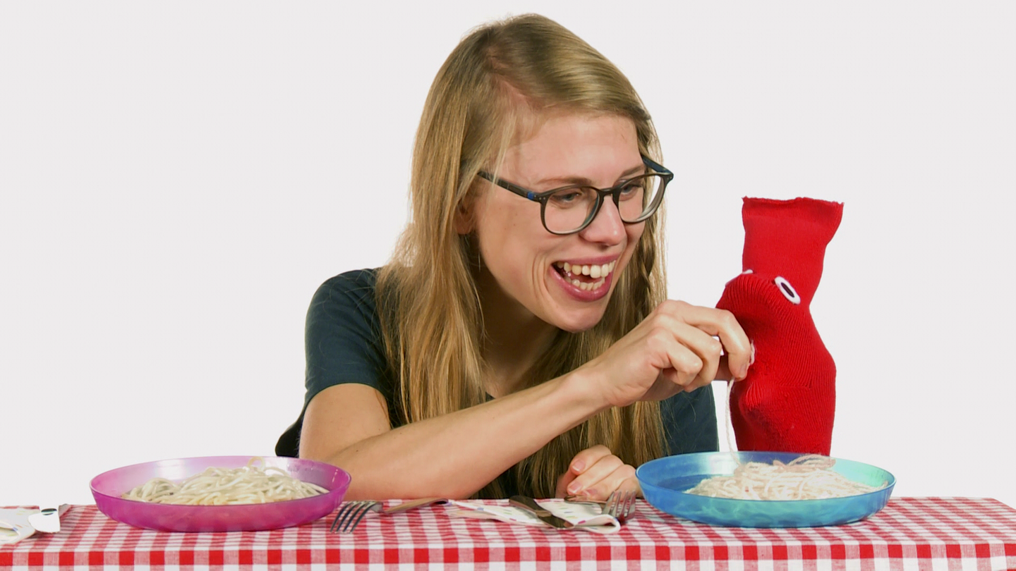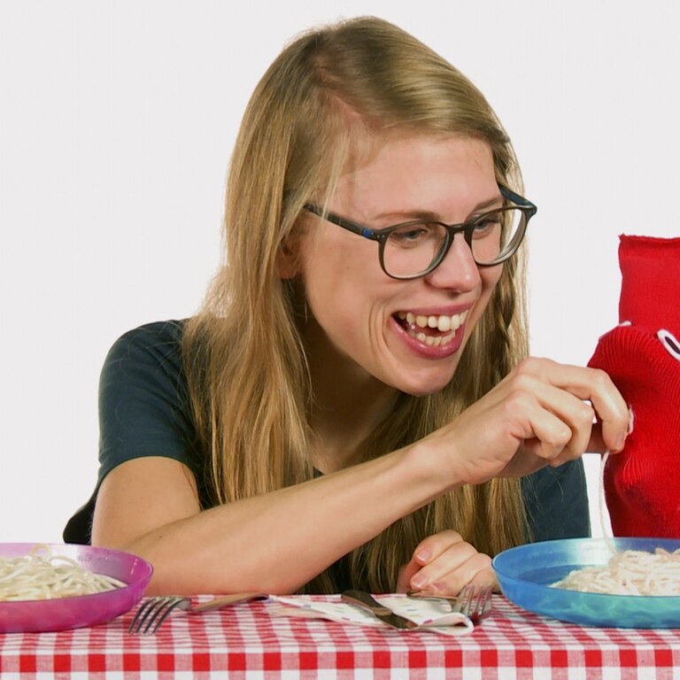 Socke und Esther decken den Tisch. „Es gibt Gabel und Messer für Dich und für mich“, sagt Esther. Doch Socke kann nicht mit Besteck essen. Zum Glück kann Esther helfen.