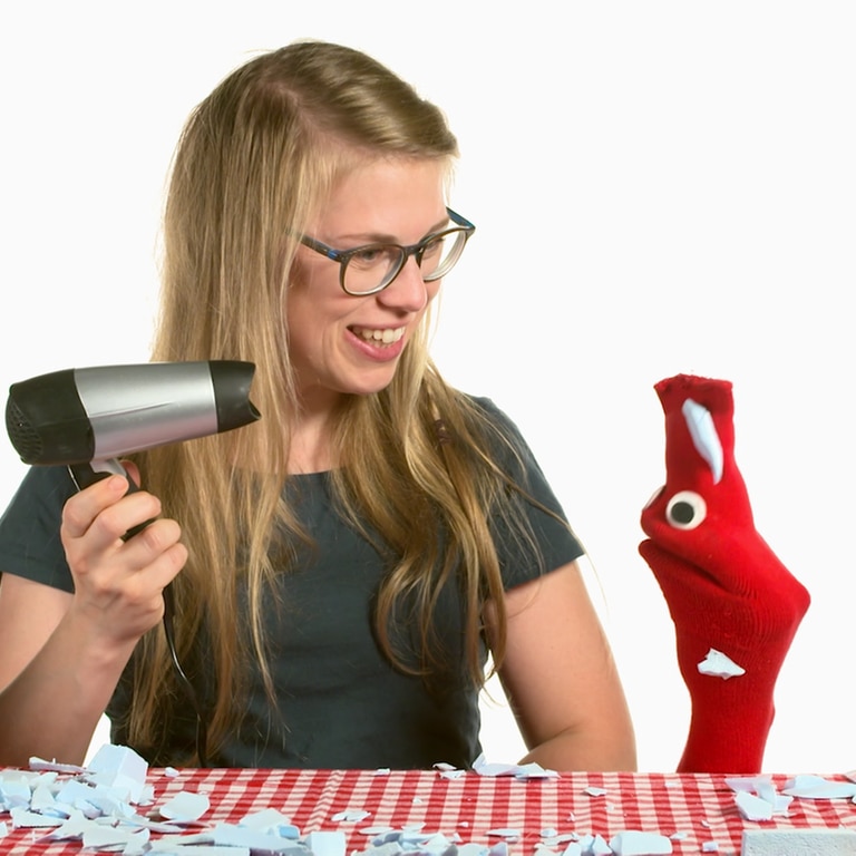 Socke ist ganz dreckig und muss sich waschen. Doch Wasser, Waschlappen und Bürste mag er nicht. Zum Glück hat Esther eine gute Idee. Aber ist der Fön wirklich die perfekte Lösung?