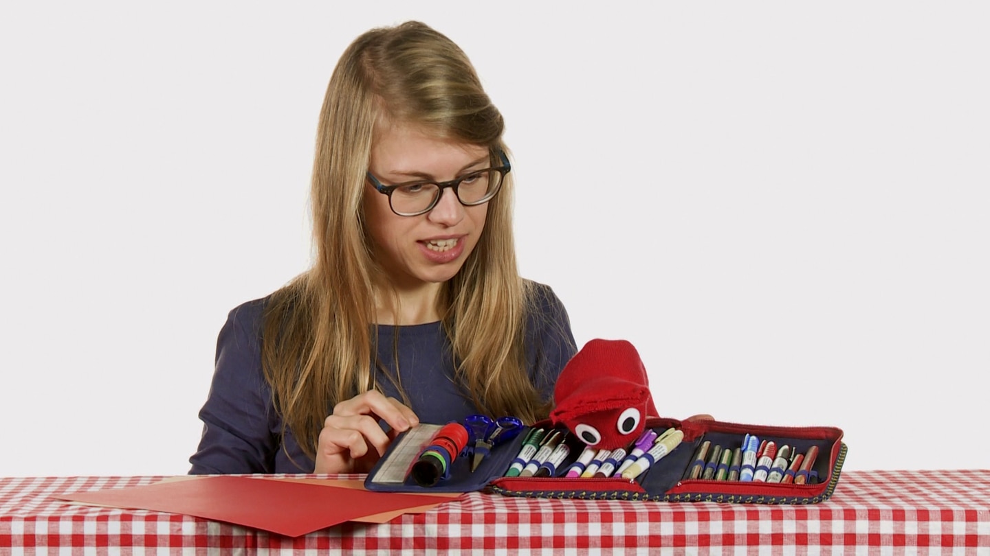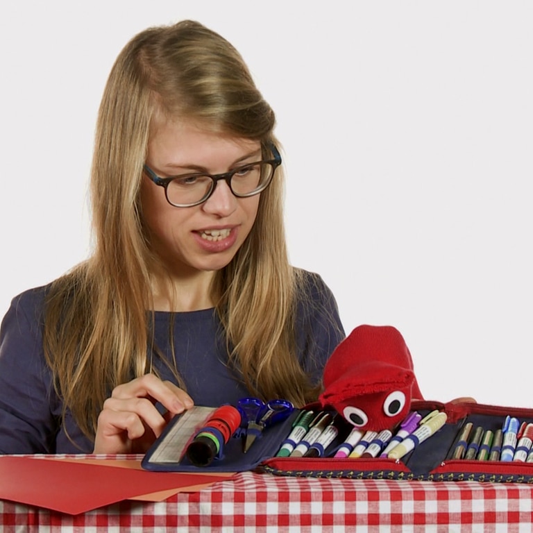 Esther zeigt Socke, was alles in seinem Mäppchen ist. Und mit Klebstift, Schere und Stift kann man tolle Figuren basteln.