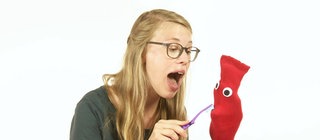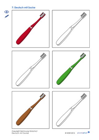 Die Klasse schaut den Clip und überlegt anschließend gemeinsam: Welche Farbe(n) hat Esthers Zahnbürste? Welche Farbe(n) hat Sockes Zahnbürste?