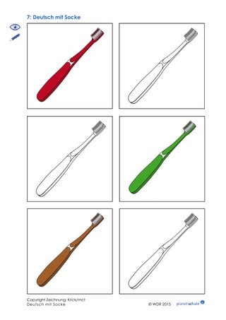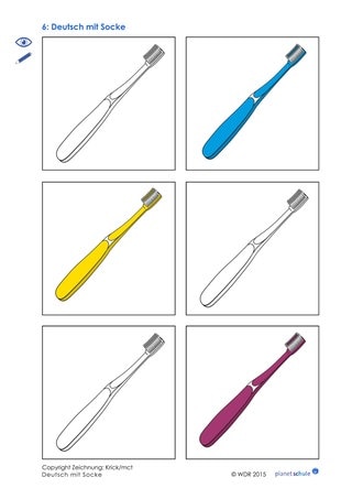 Um Farben geht es auch bei der folgenden Aufgabe: Ein Kind erhält das Arbeitsblatt 6. Das andere Kind bekommt Arbeitsblatt 7. Auf beiden Blättern sind sechs Zahnbürsten. Die Arbeitsblätter unterscheiden sich in den Farben der Zahnbürsten.