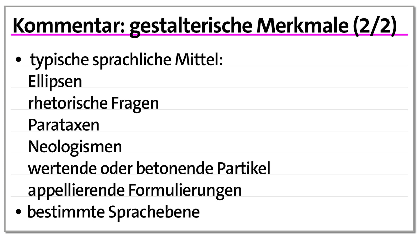 Die sprachliche Gestaltung eines Kommentars ist entscheidend für die Wirkung auf den Leser. Auf der Sprachebene kann der Autor beispielsweise umgangssprachliche Wendungen einfügen, um Nähe zum Publikum herzustellen. Die gleiche Funktion erfüllen Dialekt oder Jugendsprache. Stilmittel sind eine weitere Möglichkeit der Veranschaulichung und die Wirkung zu verstärken. Hier sind einige Beispiele für Stilmittel, die in Kommentaren vorkommen können, aufgeführt: