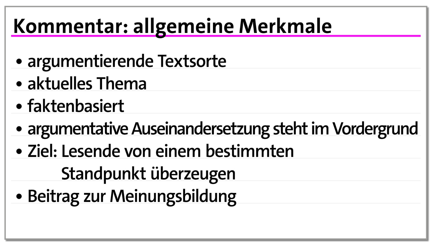 Ein Kommentar ist eine informierende Textsorte, die eine persönliche Meinung zu einem aktuellen Thema darlegt. Er ist oft provokativ formuliert und soll den Leser zum Nachdenken anregen. Ein gut geschriebener Kommentar informiert daher nicht nur, sondern kann auch eine Diskussion anstoßen und zur Meinungsbildung beitragen. Grundsätzlich gehört der Kommentar als journalistische Textsorte zu den Sachtexten und ist faktenbasiert, wobei die argumentative Auseinandersetzung im Vordergrund steht.